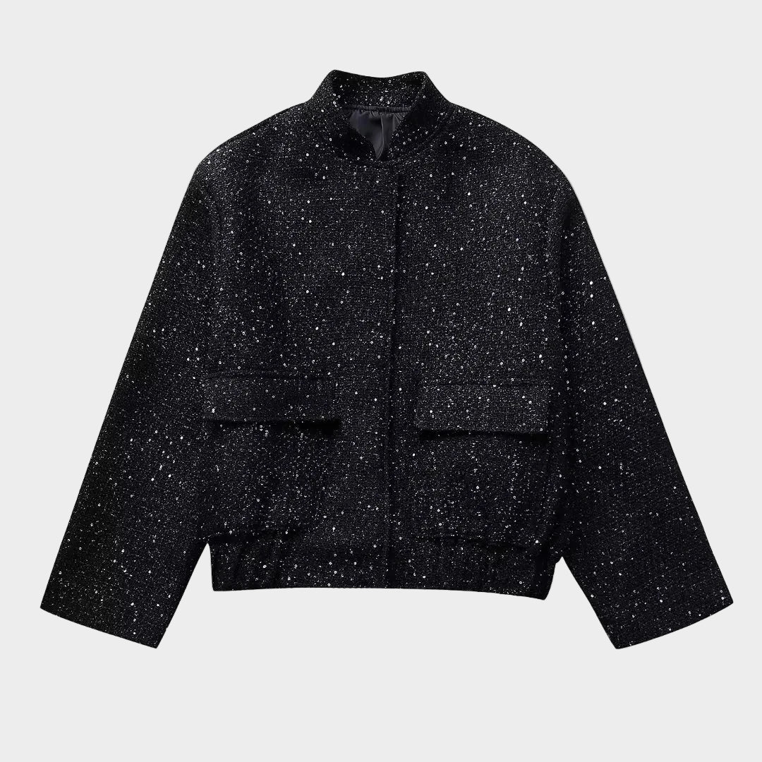 Clara žakete spīdīgi zelta tonī ar garām piedurknēm un ielas šiku