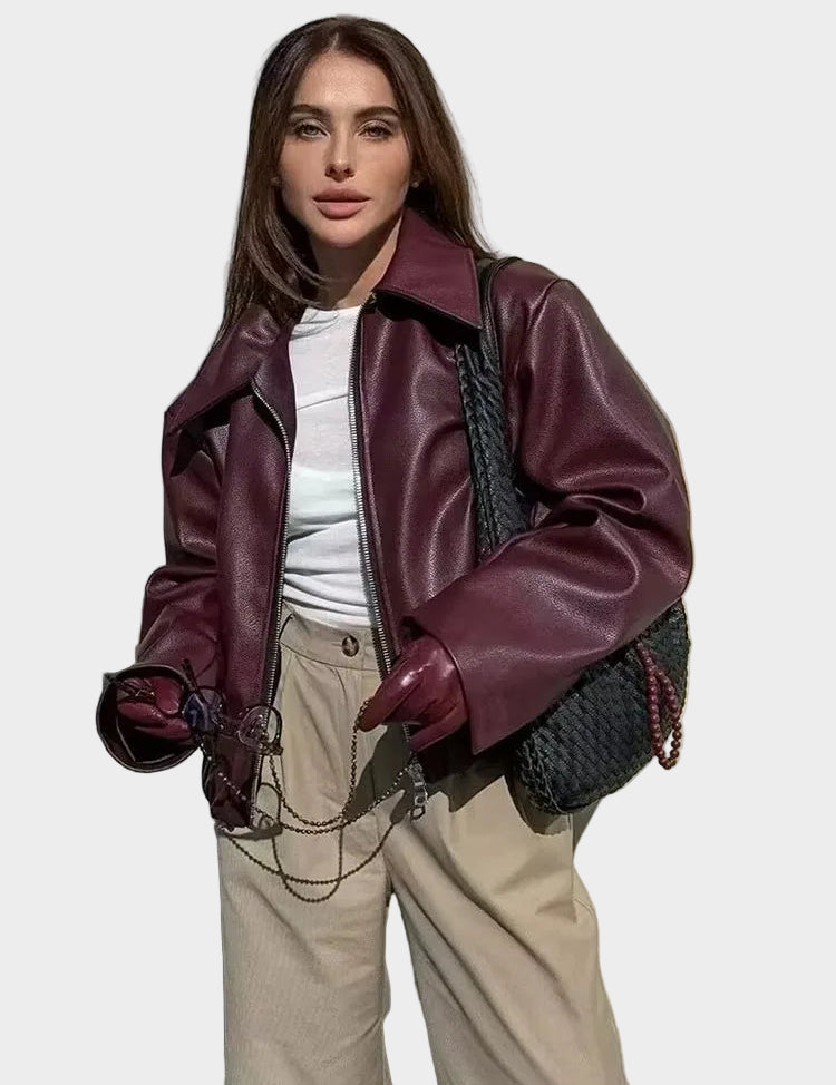 Inés PU ādas jaka vīna krāsā ar ielas šiku un biezu piegriezumu
