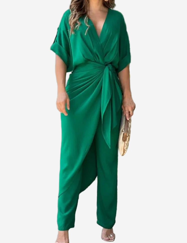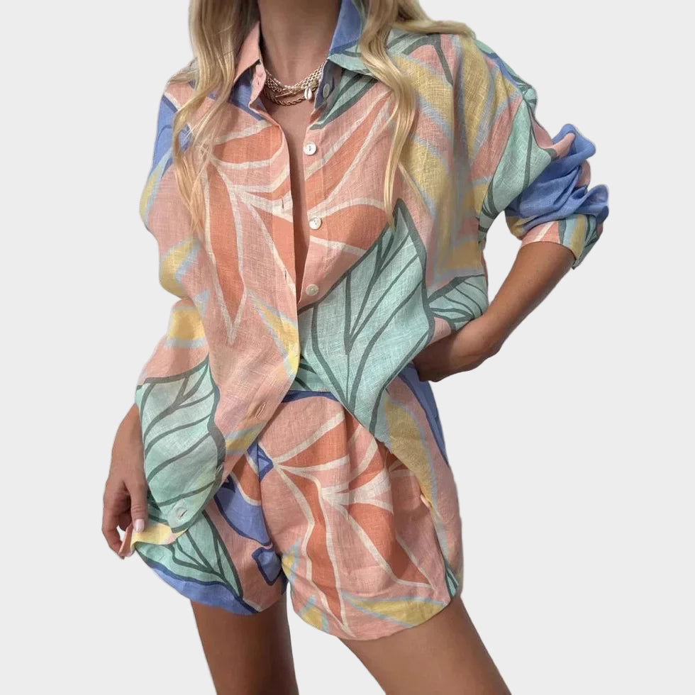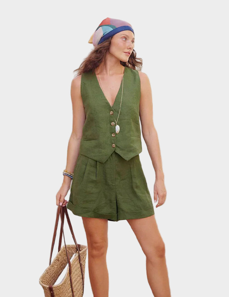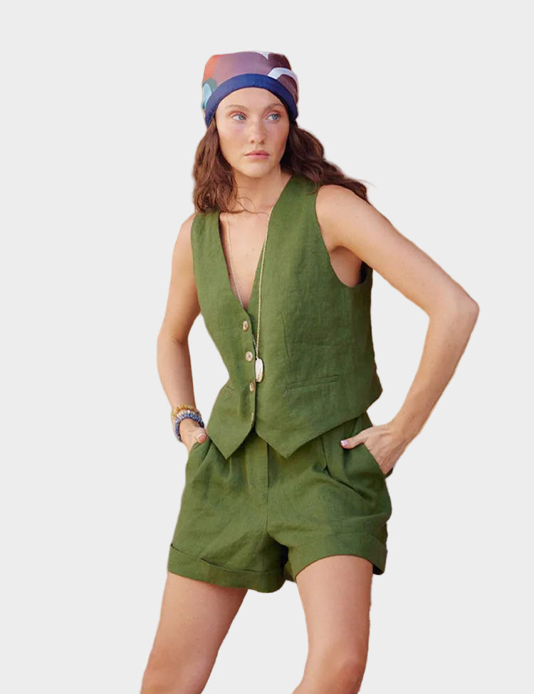 Adriana lina un kokvilnas komplekts zaļā krāsā ar pogājamu vesti un mini šortiem