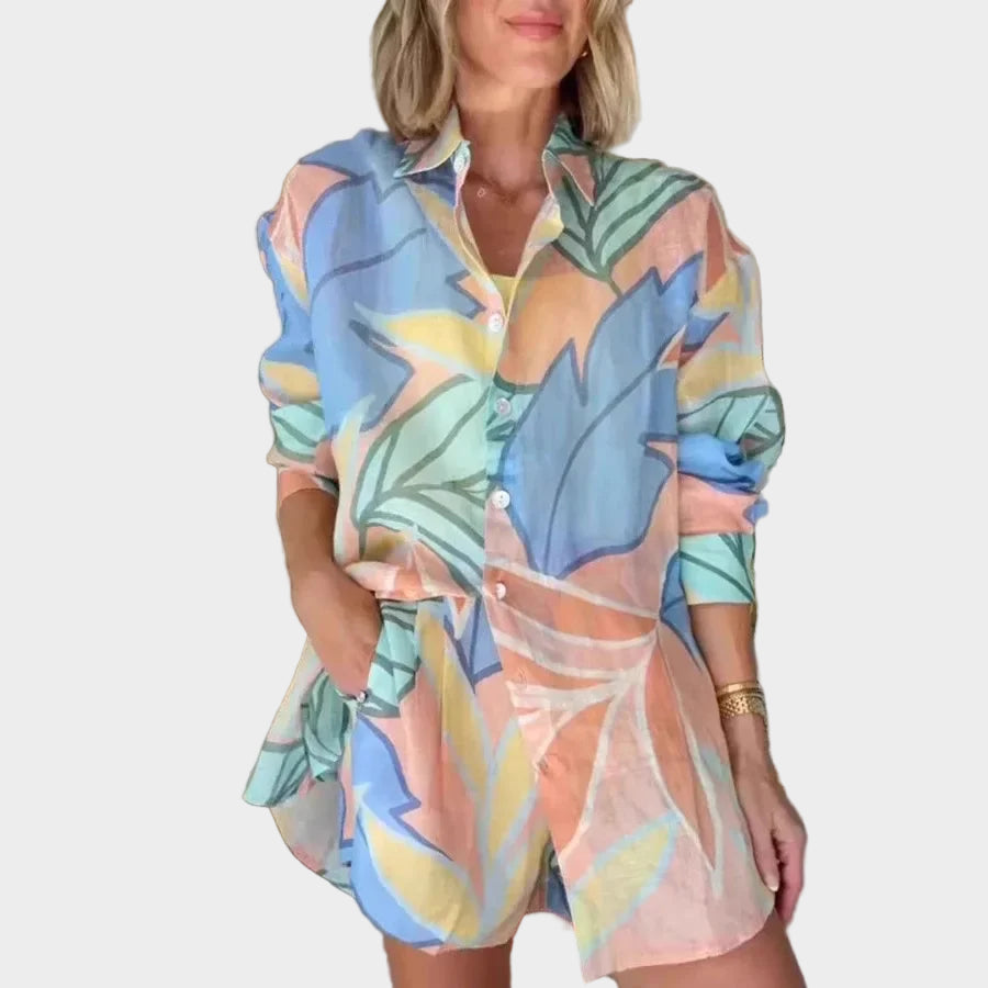 Amalia lina komplekts ar garām piedurknēm kreklu un brīva piegriezuma svārkiem
