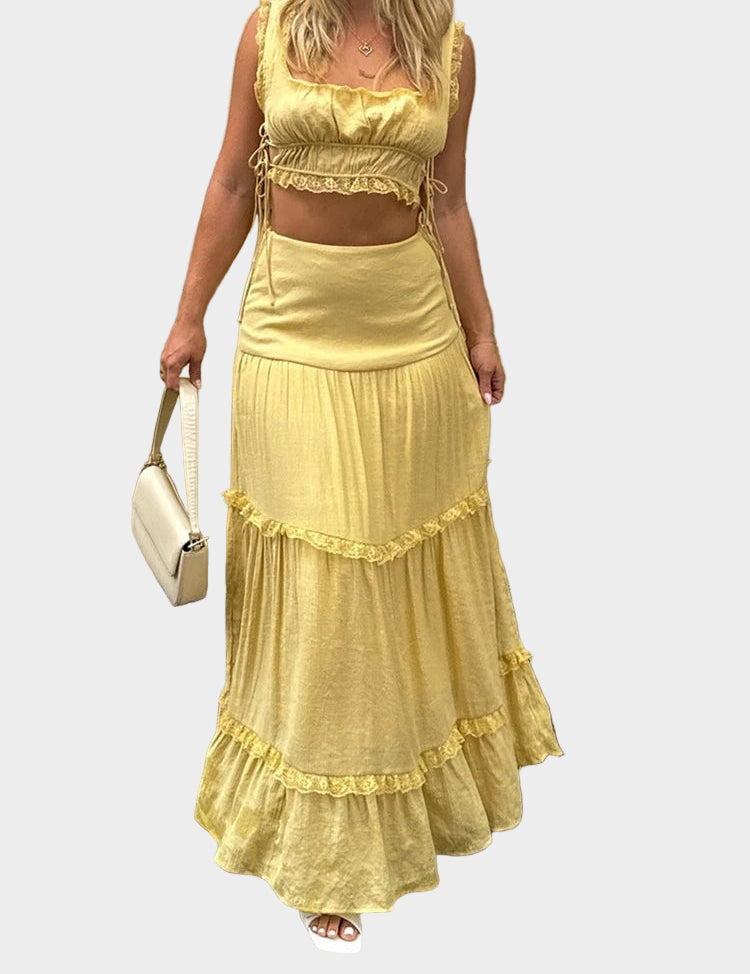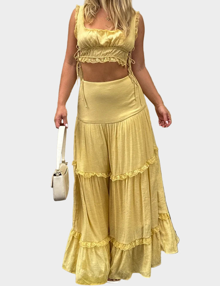 Amalia divdaļīgs romantiska stila komplekts ar īsu topu un elegantiem gariem svārkiem